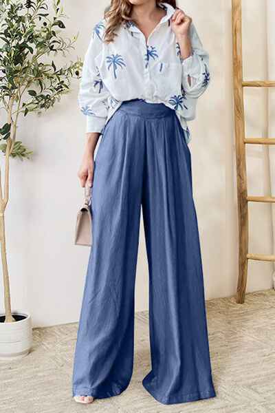 Pocketed Dropped Shoulder Shirt and Wide Leg Pants Set