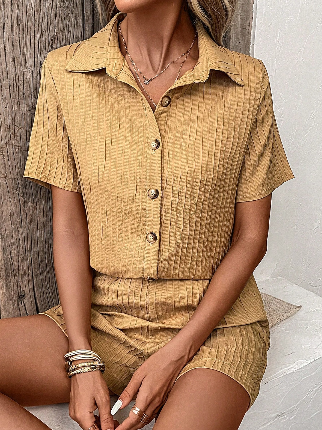 Textured Button Up Shirt and Shorts Set